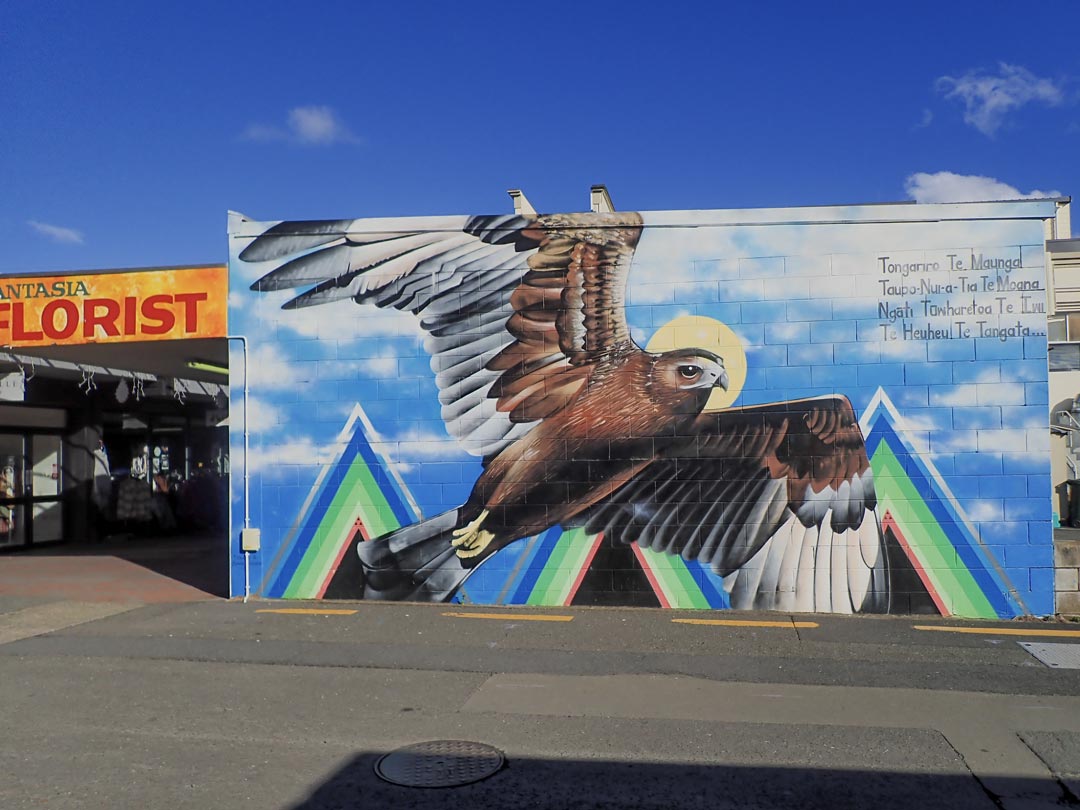 Entre le Tongariro et Rotorua, Taupo est une ville touristique connue pour son lac, son rocher gravé avec des motifs maoris, son activité volcanique et ses Huka Falls. Moins connu des touristes, son festival de street-art Graffiato mérite pourtant également le détour. En 2020, le festival en était à sa onzième édition ! Plus de 80 œuvres sont à découvrir à travers la ville. Une carte est disponible en ligne mais aussi à l’I-Site de Taupo, au musée et dans les cafés. Elle permet de ne rien louper du parcours d’œuvres fortement colorées !