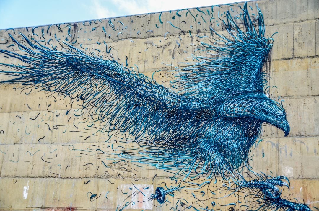 Andrew J. Steel a formé le duo « BMD » jusqu’en 2015 avec un autre artiste néo-zélandais : Damien Radford-Scott. Ils continuent à créer des œuvres de street-art à travers toute la Nouvelle-Zélande, chacun de leur côté. Des œuvres d’Andrew se trouve également à Los Angeles, Hawaï, en Australie, en Indonésie, au Sri Lanka, au Vietnam ou encore en Islande ! En plus du street-art, il peint également pour des intérieurs privés, il fait de la typographie, il dessine dans le sable et peint également des acryliques. Ses « hiéroglyphes » sont sa marque de fabrique. Vous reconnaîtrez facilement son travail !