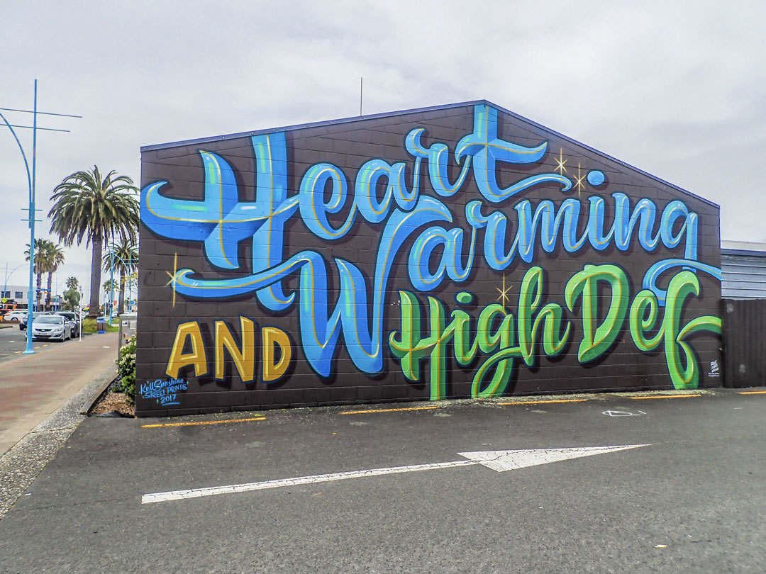 Kelly Spencer est une Pakeha (comprendre une Néo-zélandaise d’origine non maorie). Sa spécialité est le lettrage. Elle peint des mots et des citations avec des couleurs très pop la plupart du temps. Son univers est coloré et jovial, d’ailleurs elle se fait aussi appeler « Kell Sunshine ». Au-delà de cette légèreté dans son art, Kelly Spencer est aussi une artiste engagée en faveur de l’environnement. Elle voue un grand amour à Mère Nature et est une fervente du bien-être des animaux. Après avoir elle-même peint des œuvres pour le festival Sea Walls à Napier en 2017, elle fut curatrice de celui de Gisborne (Tairāwhiti) en 2018.